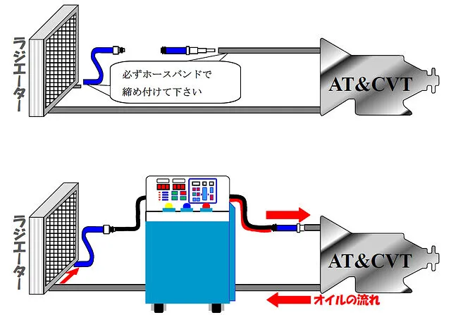 ATミッション内部のATFを、エンジン始動状態で効率よく入れ替える方法です。